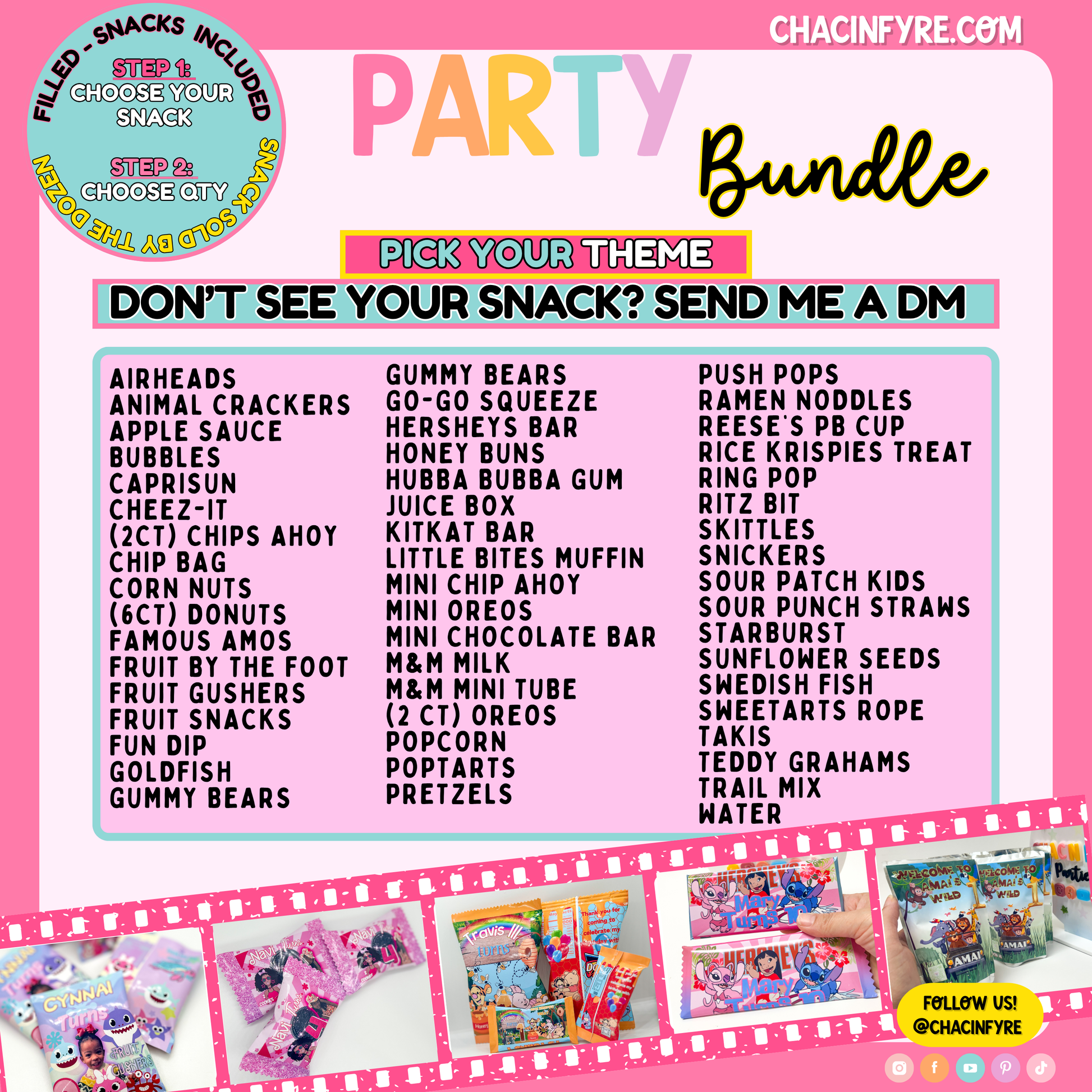 Party Bundle Filled lets you create a fully customized snack favor set — filled, sealed, wrapped, and ready to impress. Perfect for birthdays, baby showers, school events, or themed celebrations.